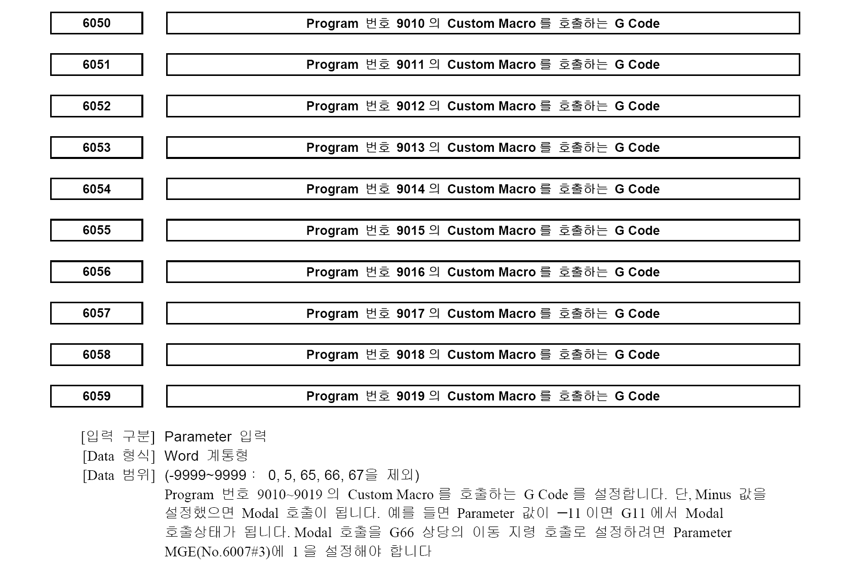 * 위 화낙 파라미터 설명문과 같이 해당 장비 파라미터에 지정된 호출프로그램 번호에 적용되는 G코드를 입력하는 방식입니다.