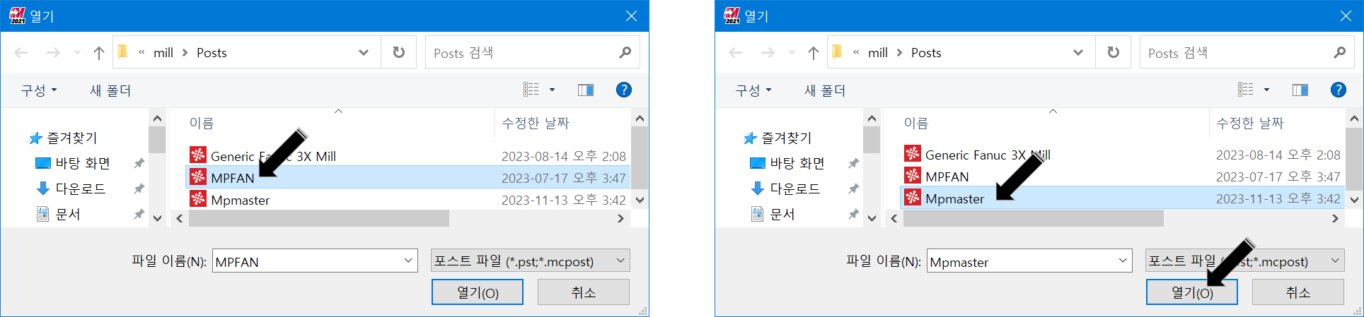 * 마스터캠의 경우 통상적으로 해당 포스트 파일 저장폴더를 "C:\Users\Public\Documents\Shared Mastercam 2021\mill\Posts"(마스터캠 2021 버전 경우)로 지정되어 있습니다.