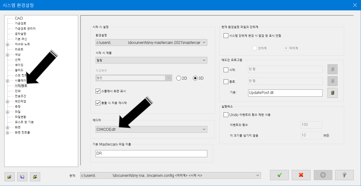 * 마스터캠 기본설정은 마스터캠에서 제공하는 MASTERCAM CODE EXPERT으로 되어 있으며 사용자가 필요시 해당하는 텍스트 에디트 프로그램을 지정합니다.