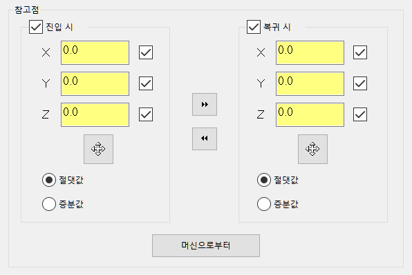 ⑥ 해당 진입 / 복귀 값을 머신으로부터 (머신정의에 설정되어 있는 참조점 값) 적용합니다.
