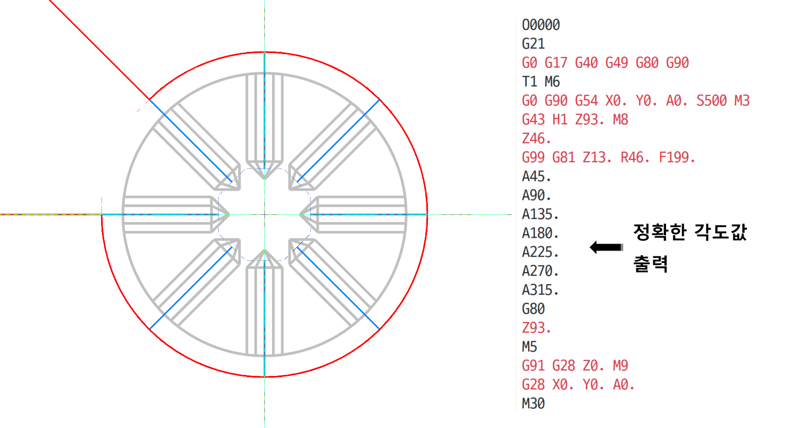 NC코드를 출력해 보니...... 원래 각도가 A0에서 시작해서 45, 90, 135, 180...... 이렇게 나와야 할 부가축 회전값이 왠지 모르게 작게 나옵니다........