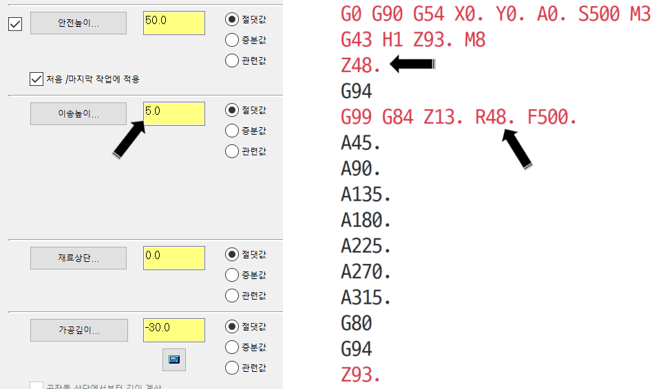 * 간혹 가다 이것을 착각하면(또는 증분값 적용 시) 소소한 차이로 공구 충돌이 발생할 수 있으므로 충분한 주의가 필요합니다.