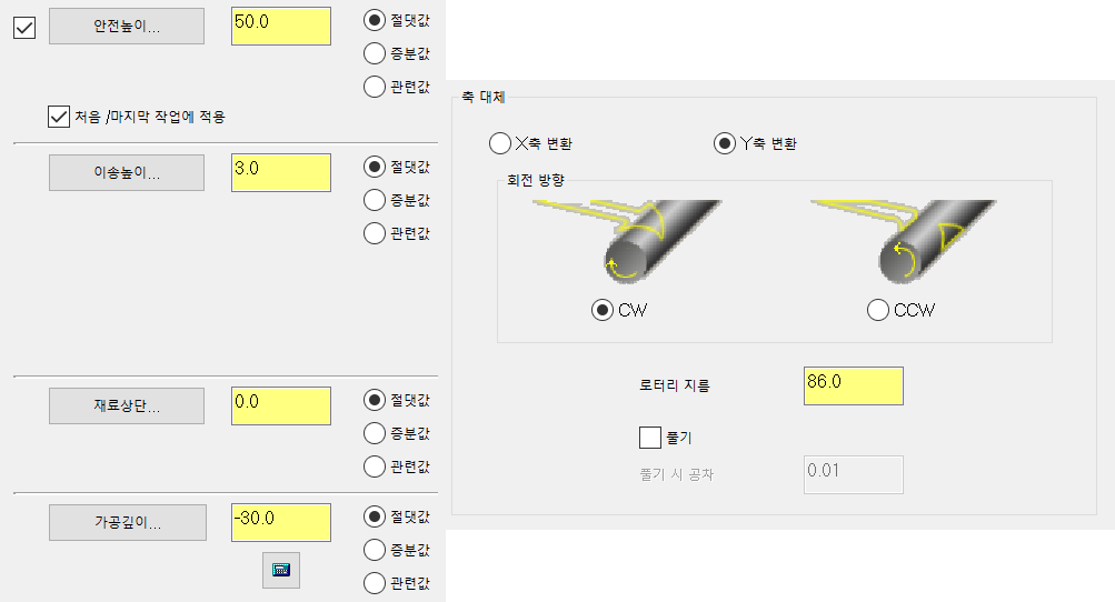(다만 항상 절대/증분 적용 관련 없이 출력된 NC데이터를 검토하여야 합니다. 높이 값 적용이 항상 회전축(소재중심)에 기준되어 산출됩니다.)