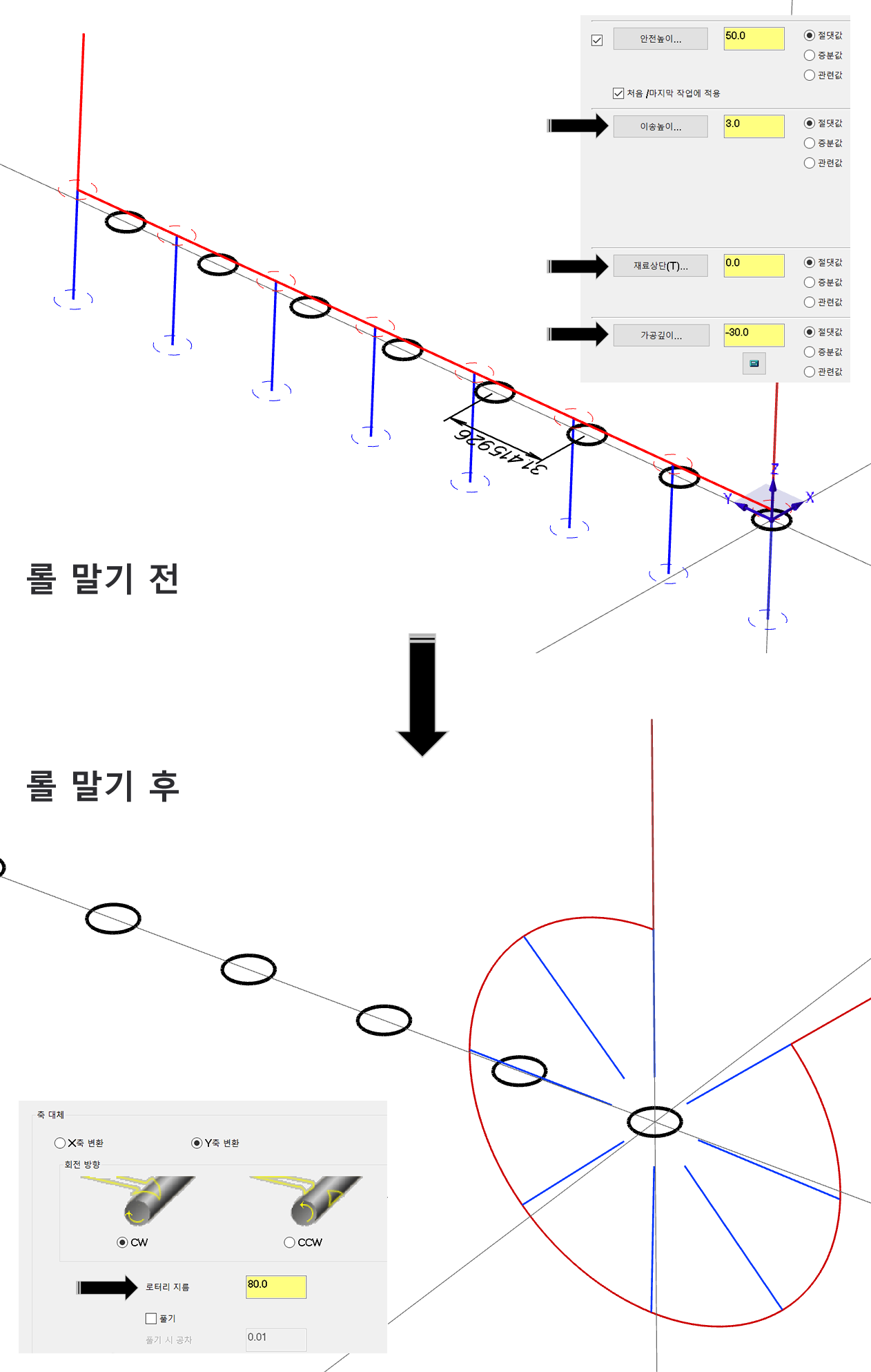 * 롤가공 적용 시 무조건 소재원점(가공원점)은 회전축에 Z값이 고정(Z0.0)이 됩니다.