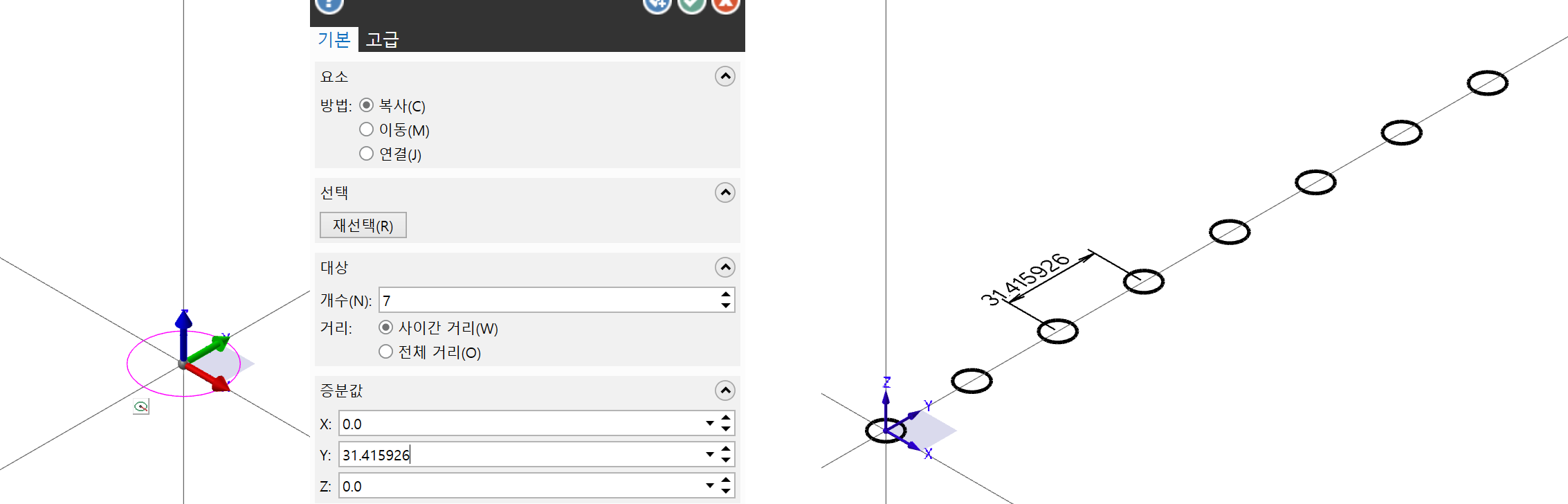 그래서 10 Ø 원호를 Y축 방향으로 8개소, 홀 간 거리(31.415926)로 평행이동(복사)을 합니다.