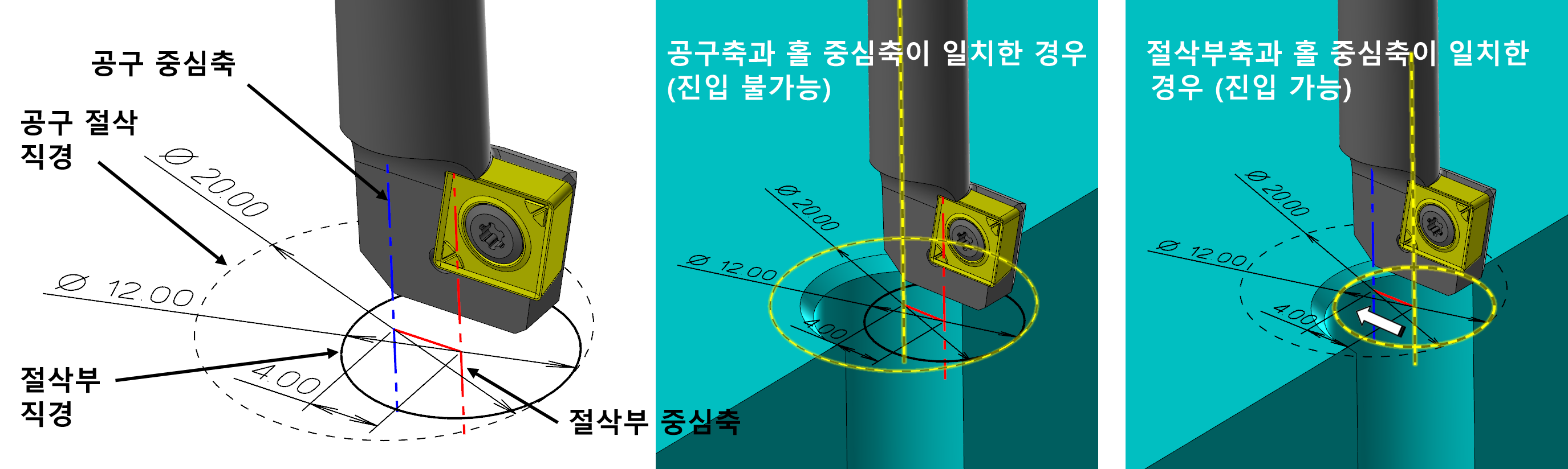 ③ 절삭부 중심축과 홀 중심축이 일치한 상태로 수직 진입