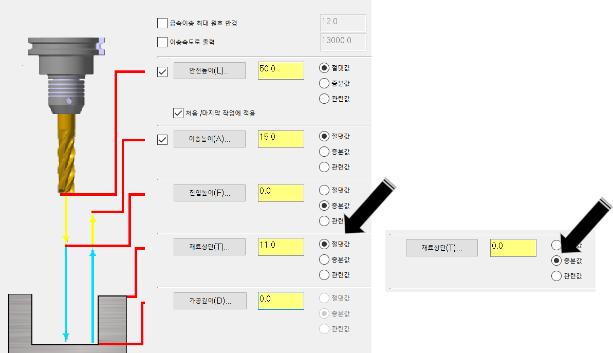 링크 파라미터는 작업자 선택에 따라 각 항목의 값을 정의해 주면 되며 재료상단 높이를 절댓값으로 지정 시 (Z11.0), 증분값(3D 도형요소의 경우 도형요소 좌표값에 따라간다는 의미)으로 지정 시(0.0)로 지정할 수 있습니다.