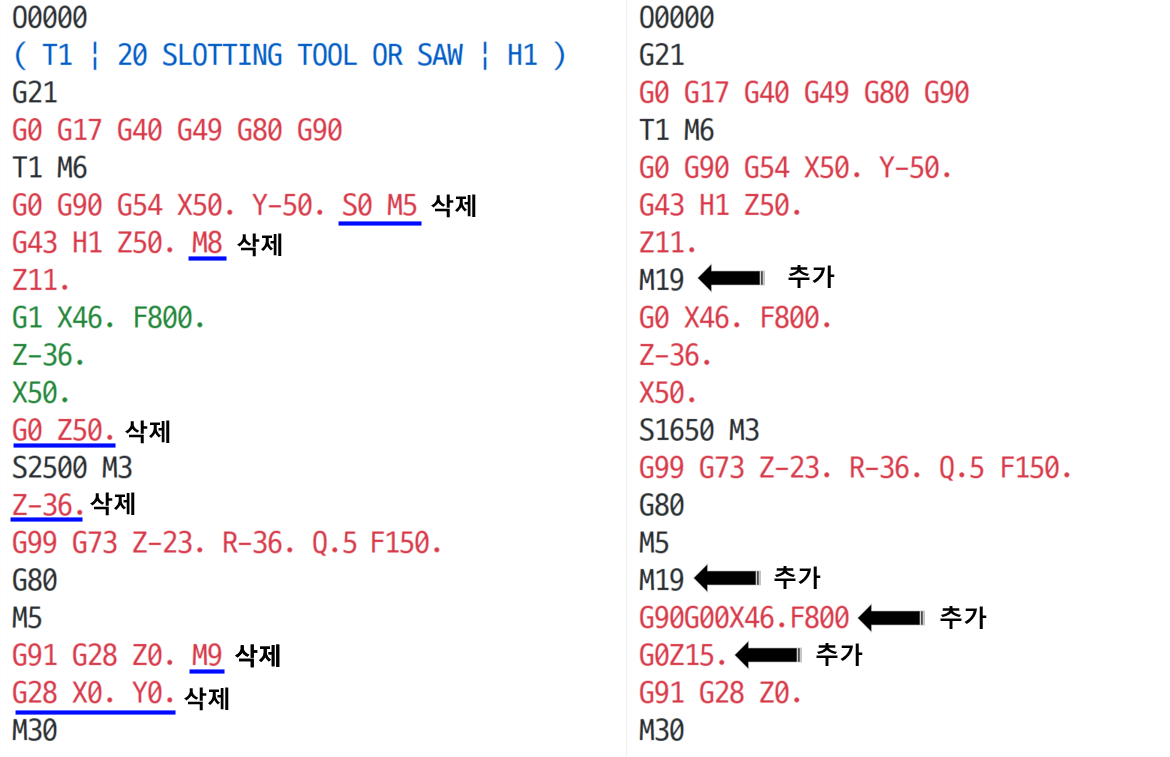 일단 복잡한 주석문은 삭제하고 원본 NC데이터와 수정된 NC데이터를 비교해 보겠습니다.