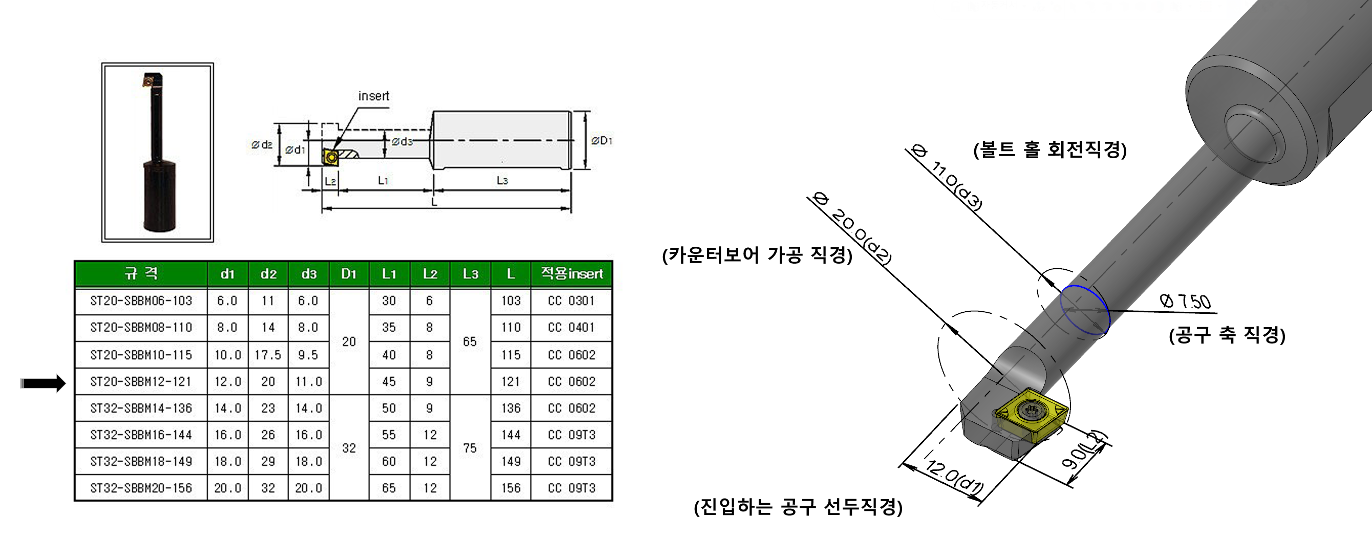 기본적으로 M12 카운터보어 직경(D)이 20.0 이므로 해당 공구의 가공날 끝 부분이 회전 시 직경 20.0이 되어야 하며 편심된 축의 회전시(축 지름이 아니고) 전체 지름값이 해당 규격(M12 이므로 13.5)보다 작아야 합니다.