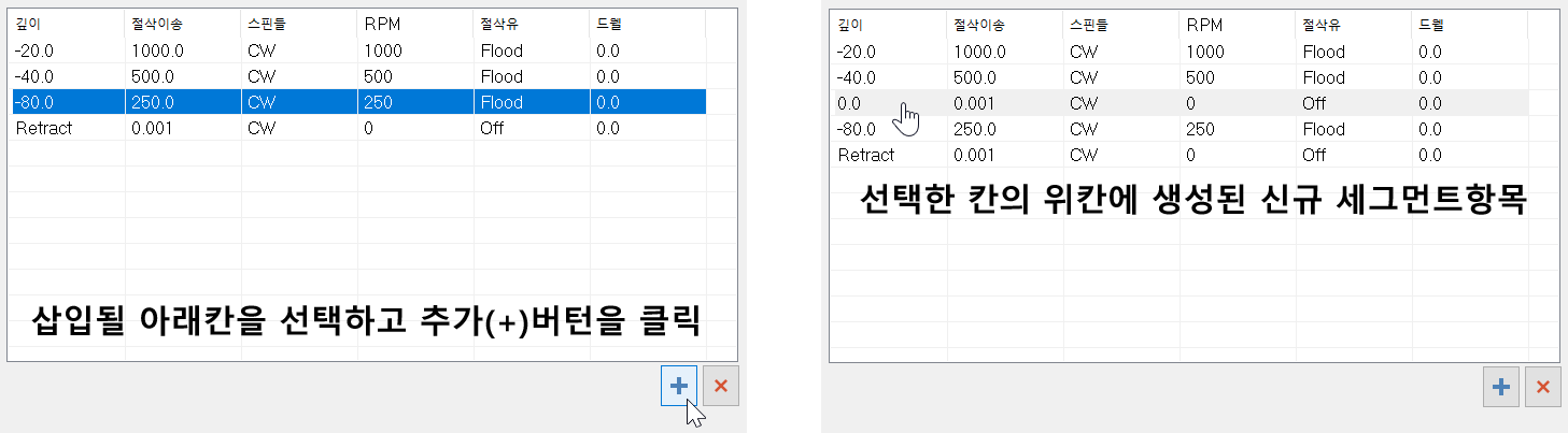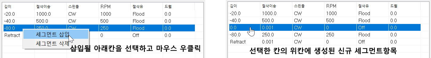 * 맨 하단의 Rertact 항목은 현재 정의된 세그먼트 내용을 취소하고 R점 복귀점(링크 파라미터 이송높이값)으로 복귀하는 것을 말하는 것이며 해당 항목 명칭은 수정이 불가능하면 세그먼트 삭제도 불가능합니다.