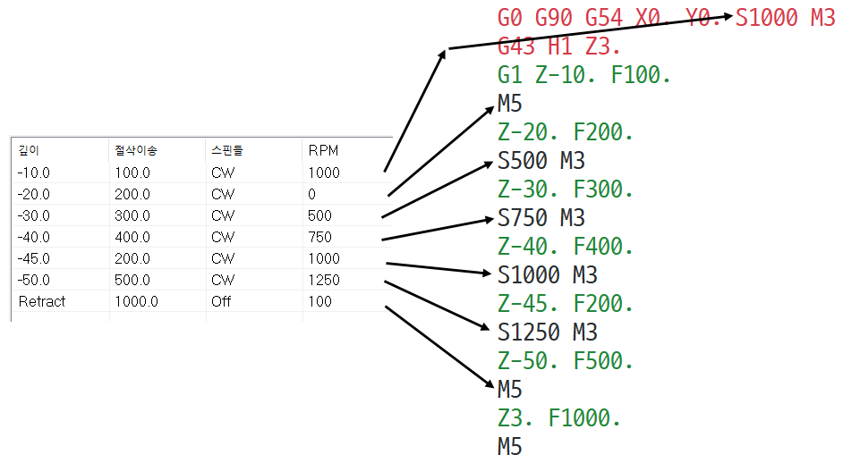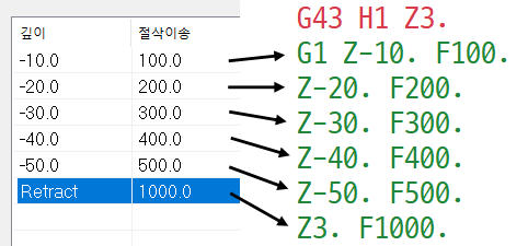 * 특이점은 그래도 각 홀 진입위치 까지는 높이별로 급속이송으로 이송되어 실제 가공구간만 칩 브레이크 이송을 한다는 점입니다.