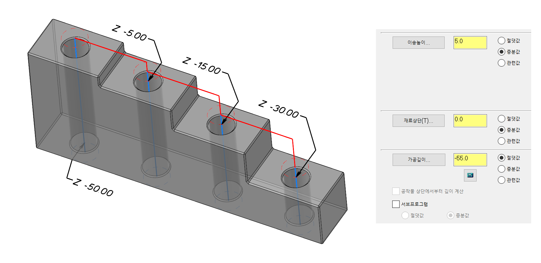 * 위 드릴 가공정의는 해당 홀위치 점체인을 각 진입높이값(계단별)에 생성하여 증분값으로 지정한 경우입니다.