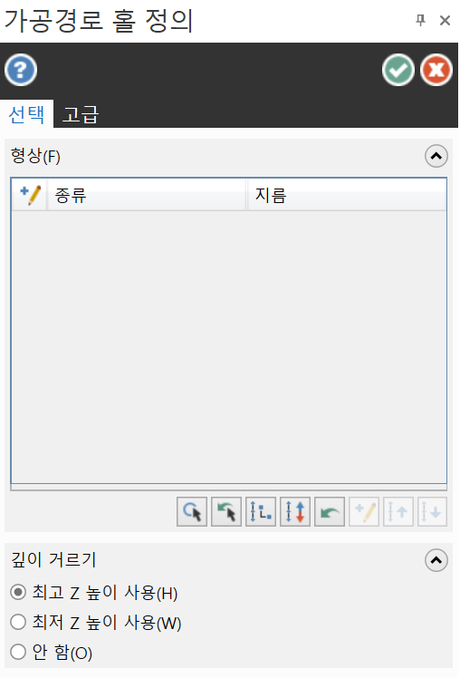 (주의 사항 기존적으로 선택한 홀 체인요소의 높이값에서(Z0.0에서 상대적으로 증분 됨) 증분 되기 때문에 경우에 따라서 Z0.0이 아닌 홀 체인요소를 선택한 경우 그 체인요소의 높이값에서 증분 된다는 것을 주의하셔야 합니다.)