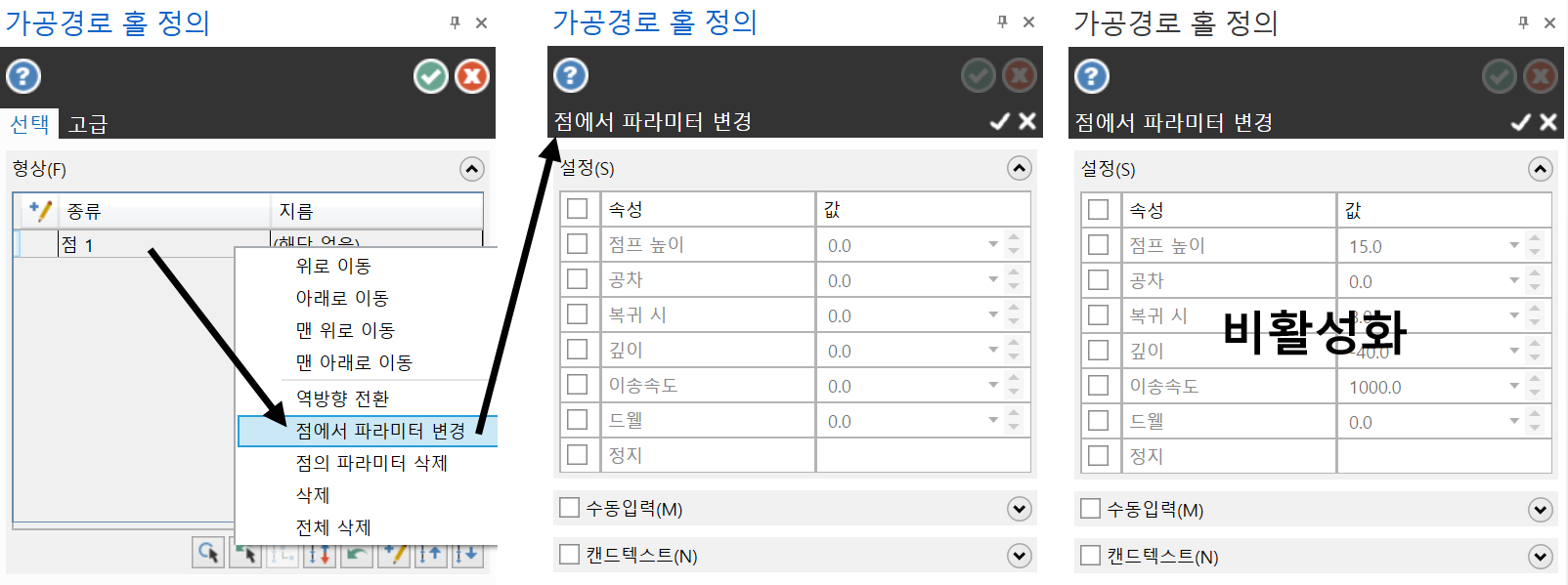 * 다만 일반적인 드릴공정(고정 사이클)에서 선택된 점의 파라미터값 변경이 먹히지만, 어드밴스 드릴에서는 점에서 파라미터 변경 항목에 임의값을 넣어도 해당 가공경로가 생성되면 전부 비활성화됩니다.