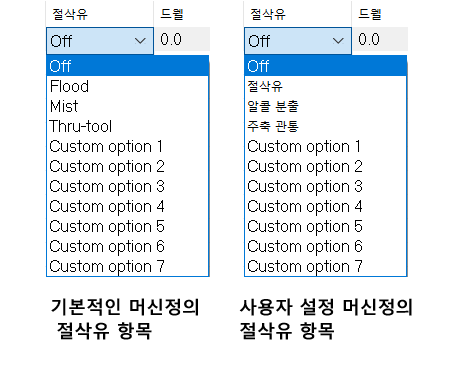 기본적으로 해당 마스터캠 머신정의 절삭유 설정에 따른 절삭유 선택 항목 중 선택합니다.
