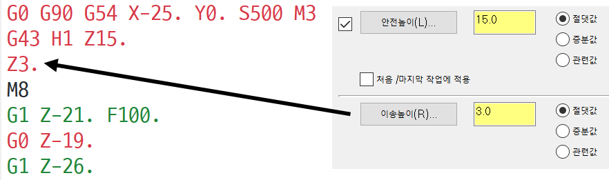 * 이송높이 증분 높이값으로 적용한 경우는 급속이송 속도로 이송 됩니다.