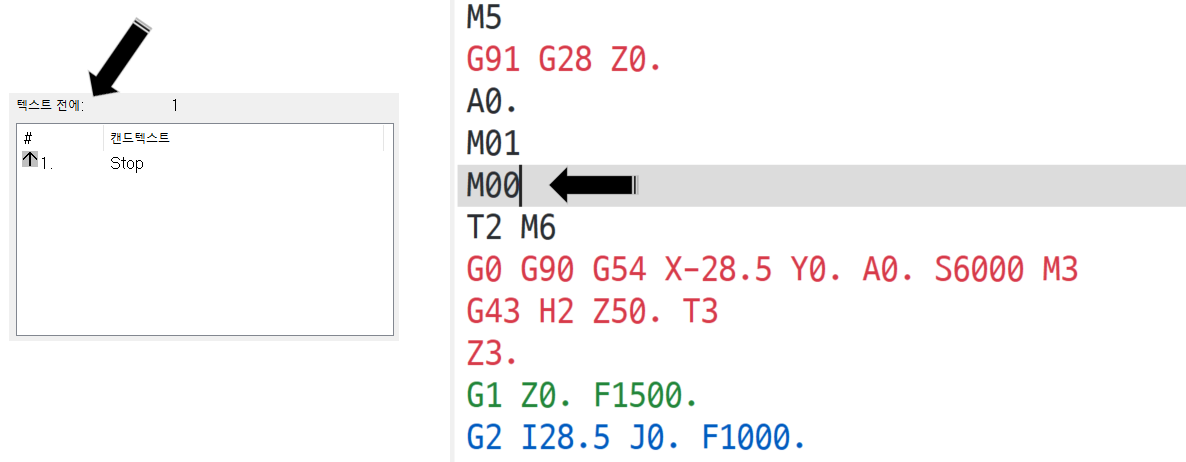 그러므로 처음 예제처럼 공구 교환 되고 M00 지령이 되도록 캔드 텍스트를 지정한다면 "텍스트 함께" 항목에 Stop 지령(M00)을 설정하면 공구 교환 후 M00 지령이 실행됩니다.