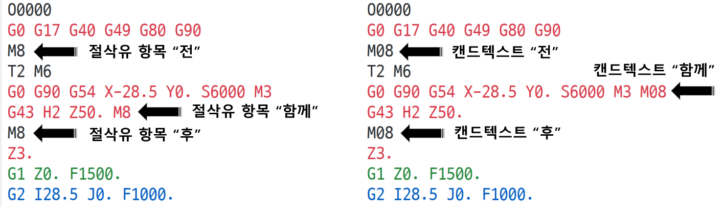 * 절삭유&캔드텍스트 "전"은 사실상 공구교환 전이므로 안되지만 "함께" M8출력위치가 살짝 다르므로 절삭유 분출시기(절삭유 압이 낮아 늦게 분출)를 앞당기고 싶은 경우 또 다른 방안이 될 수 있습니다.