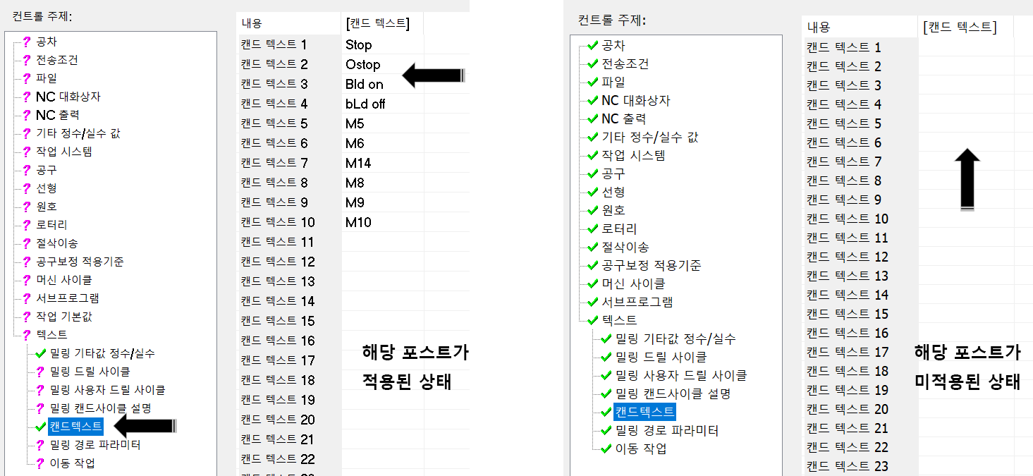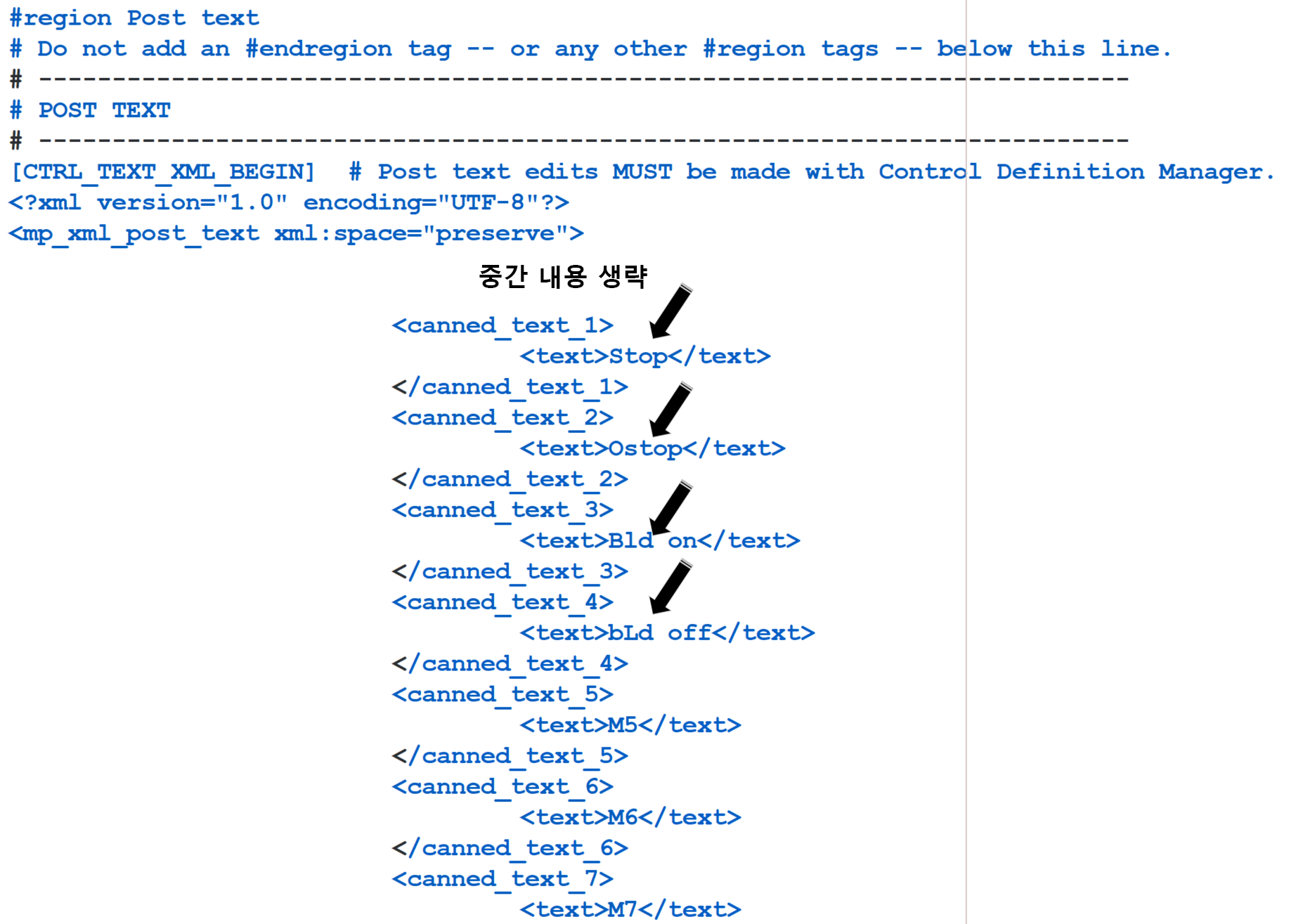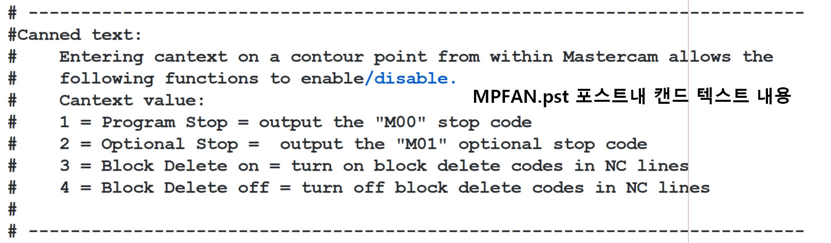 이러한 의미에서 캔드텍스트 기능은 사전에 미리 준비된 사용자 지령문(또는 특정 기능)을 포스트 상에서 정의하는 캔드텍스트 문자열(포스트 항목 중 캔드텍스트 설정 내용이 있고 포스트상에서 주석처리(포스트 내부에서 작동하지 않음))항목에 입력해 놓으면 마스터캠 캠작업 시 해당 포스트를 지정(포스팅 과정을 거친)되면 해당 캔드문자열 내용을 해당 머신정의 컨트롤 설정 캔드텍스트 항목에 입력 이후 마스터캠 가공정의 작업시 해당 포스트의 캔드 텍스트 항목 적용이 가능해집니다.