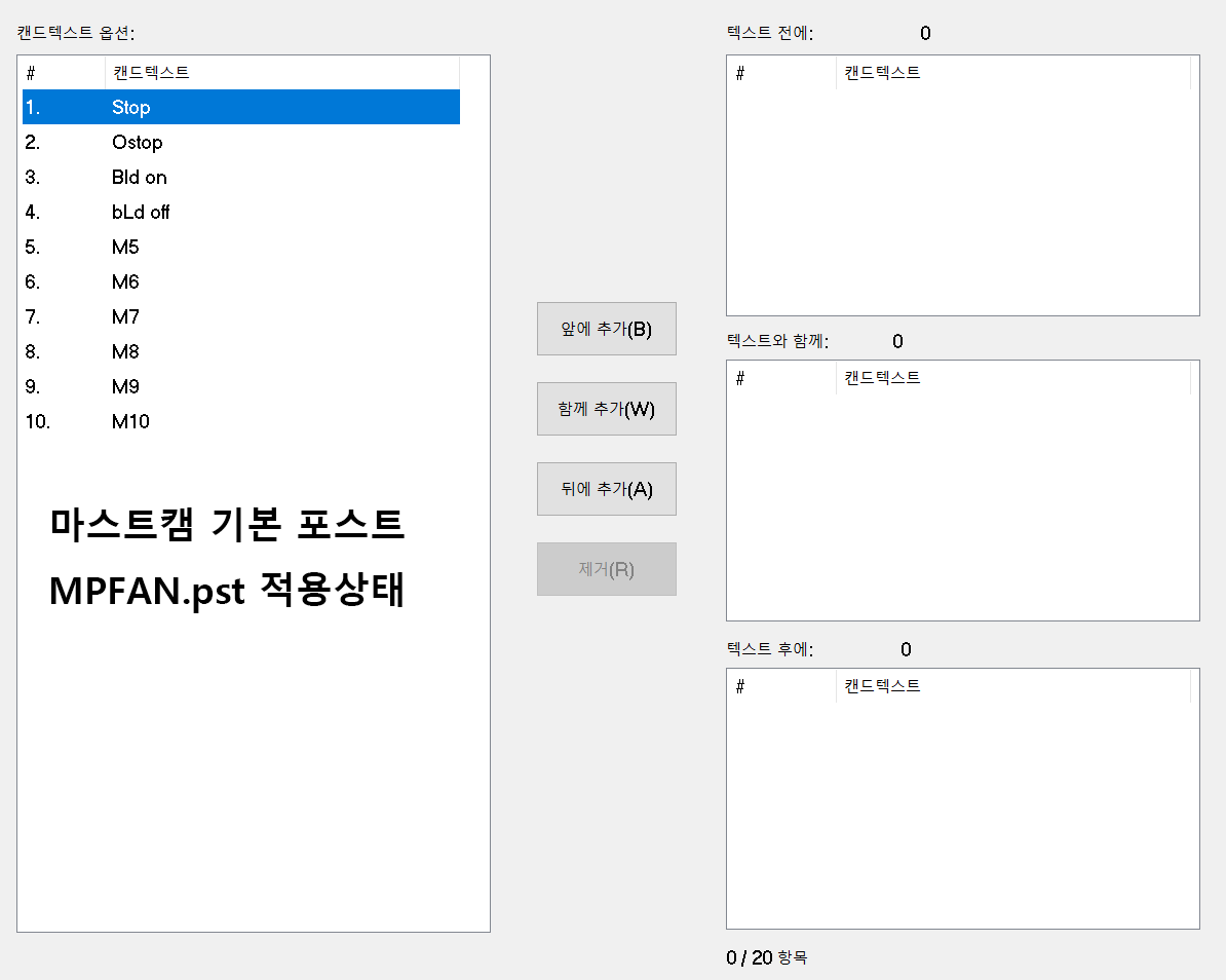 위 포스트의 캔드 텍스트 내용을 해당 포스트가 마스터캠 실행이 같이 적용되며 우선 해당 머신 정의 - 컨트롤 정의 캔드 텍스트 항목에 입력됩니다.